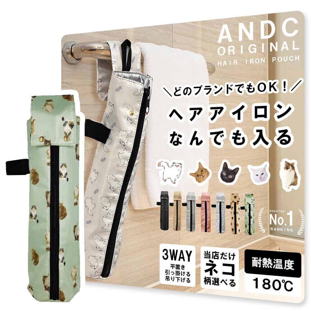 【在庫セール】AndC ヘアアイロンケース 耐熱 ポーチ 収納 吊り下げ 熱いまま ネコ柄 かわいい (ネコ柄(ミント))