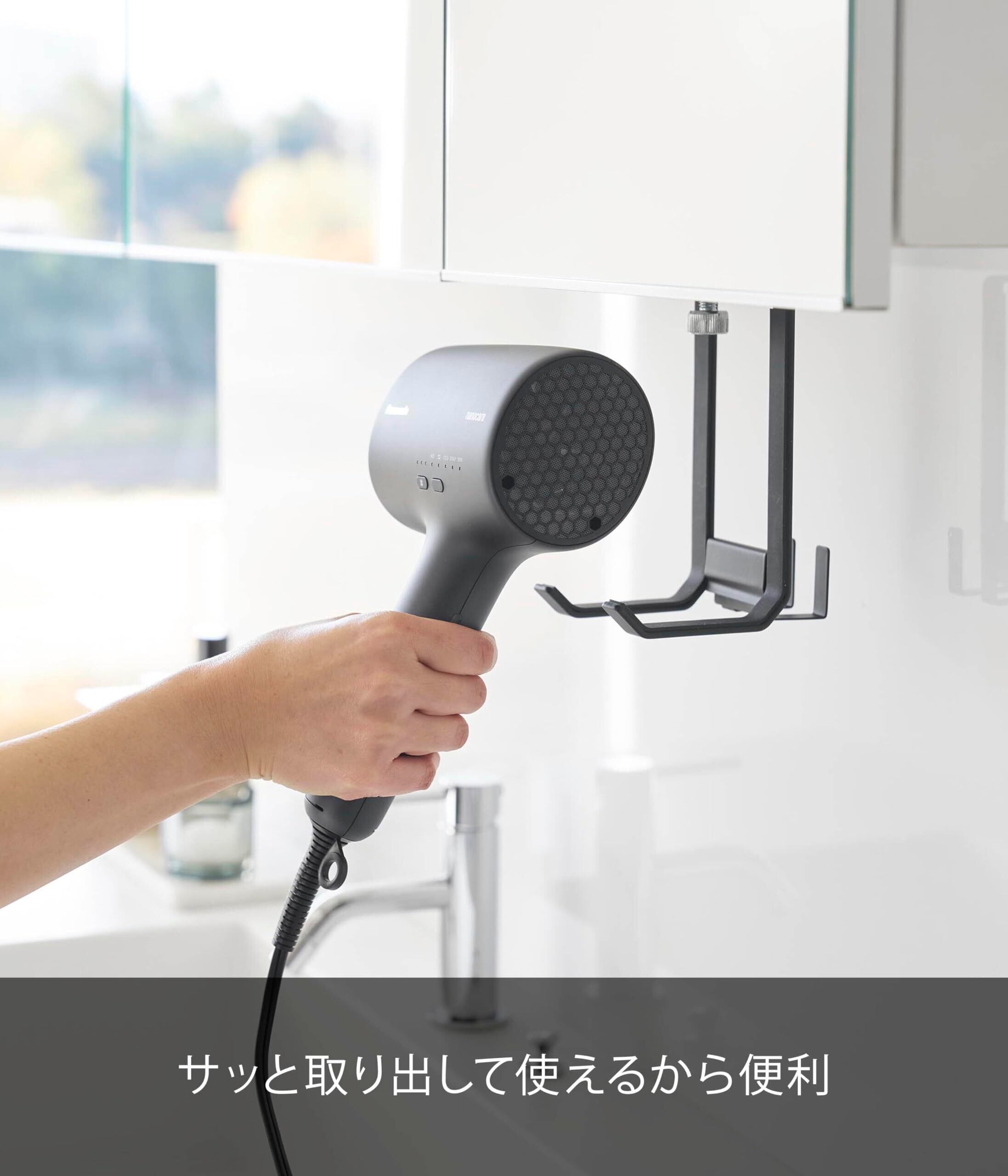 「山崎実業の棚下ドライヤーハンガーで、スタイリッシュに収納し、毎日のヘアケアをもっと快適に楽しんでみませんか!」
