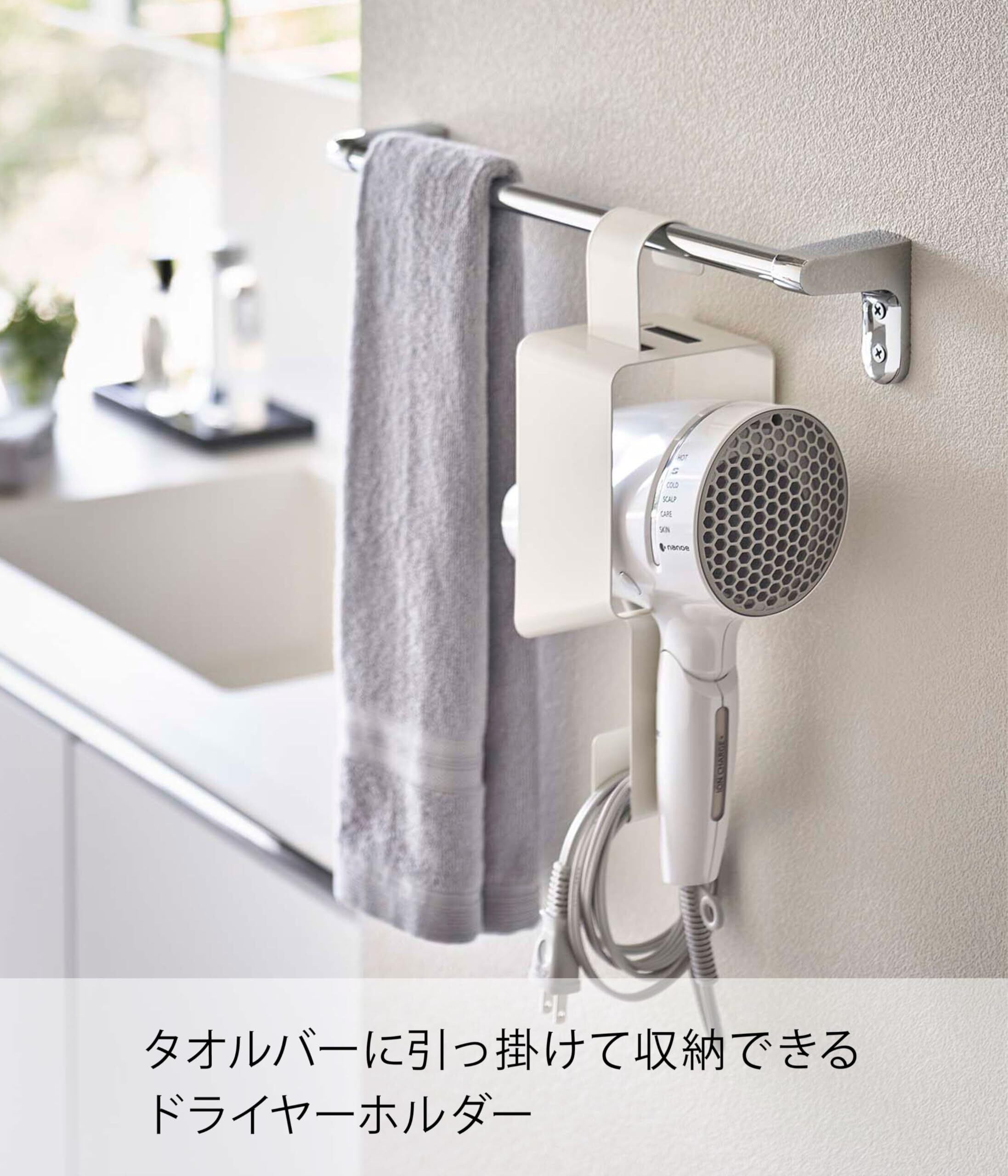 「山崎実業の引っ掛けドライヤーホルダーで、シンプルに収納し、毎日のヘアケアをもっと快適にお楽しみください!」
