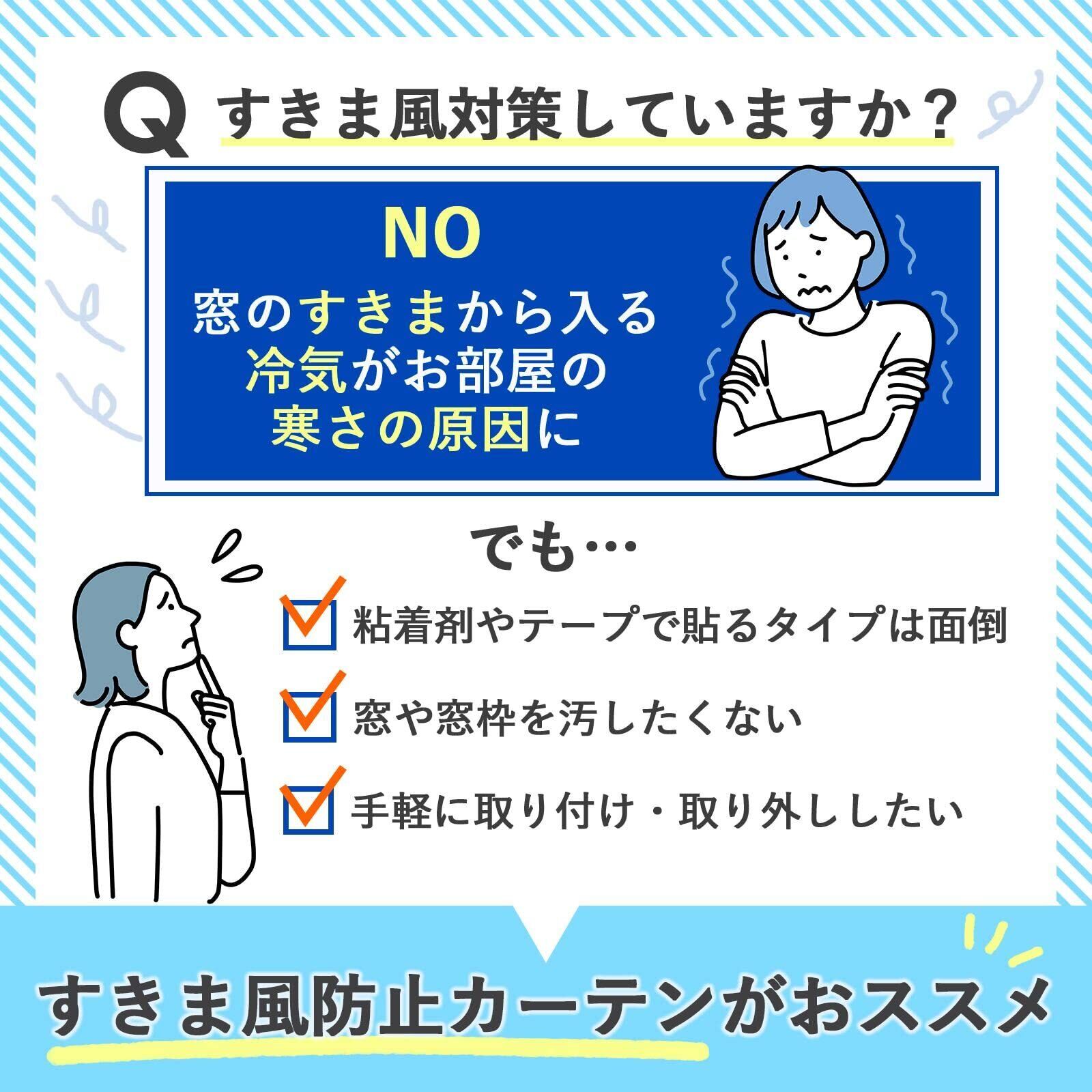■【すきま風を防ぎ、快適な室内環境を実現!】コモライフのすきま風防止カーテンは、幅110cm、丈225cmの2枚セットです。寒い季節にありがちな隙間からの冷気をブロックし、心地よい室内温度を保ちます。暖房効率を高めるので、冬の暖かさを逃がしません!