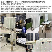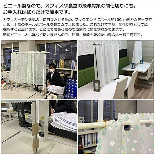 お風呂場・脱衣所など外からの視線が特に気になる場所に最適のカフェカーテンです。とにかく外からとても見えにくいので、視線をしっかりとシャットアウトしたい場所におすすめです。PEVA(ポリエチレンビニールアセテート)という防カビ素材を使用しているので水周りでも安心です。目隠しだけでなく、断熱性のための間仕切りとしてもおすすめできます。※PEVAに毒性はありません。つっぱりポールを使っていろんな場所に手軽に付けられます。ハサミで簡単にカットができる素材です。 高さが長めのサイズをカットして、必要なスペースにサイズを合わせて使うこともできます。棒をブックエンドに取り付けて掛けるなど、どこにでもあるもので簡易的に間仕切りができます。ビニール製なので、オフィスや食堂の飛沫感染対策の間仕切りにも。お手入れは拭くだけで簡単です。