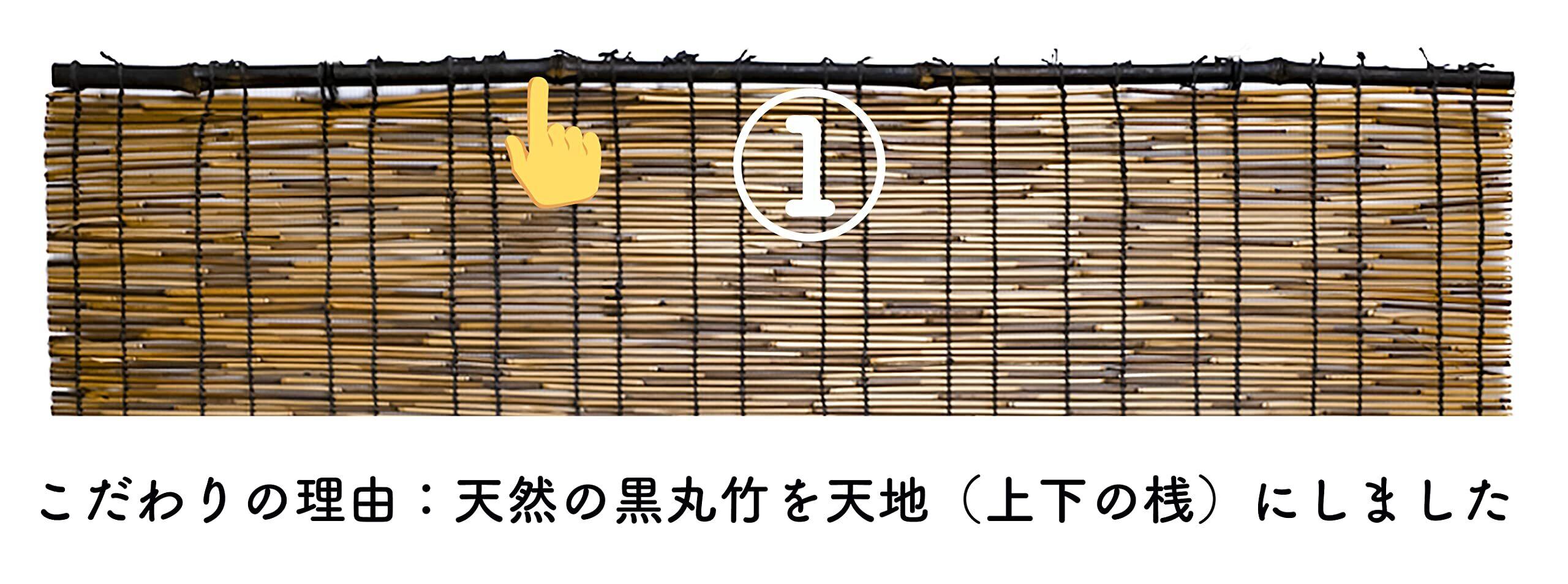 一般のすだれは上下の桟に平竹が使用されておりますが、こだわりいぶし焼すだれは反りを抑えるため天然素材の黒丸竹を使用しております、この黒丸竹を天地に使用することにより耐久性に優れ丈夫でインテリア性にも優れた商品に仕上がっていますので室内室外を問わずにお使いいただけます