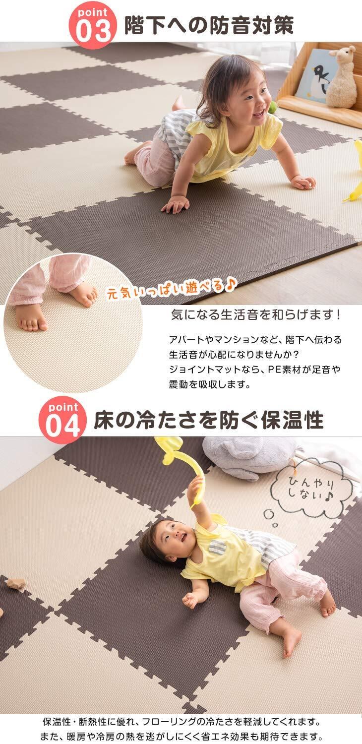 "・表面の凹凸の深さに若干の個体差がある場合がございます。 ・ロットによって色味が異なる場合がございます。 ・床暖房の種類等によって、商品に多少の反りが生じる場合がございます。 ・PE素材の特性上、使用するうちに負荷がかかる部分に多少のへたりが生じます。 そのため、既に使用しているマットに新しいマットを繋げて使用する際、上手く繋がらない場合もございますので、予めご了承ください。 2019年1月10日に素材をEVAからPEに変更しました ※床材(塩化ビニル・フローリング等)によって、色移りや変色が起こる場合がございます。床とマットの間に敷物や防護シートを敷いていただくことを推奨しております。"
