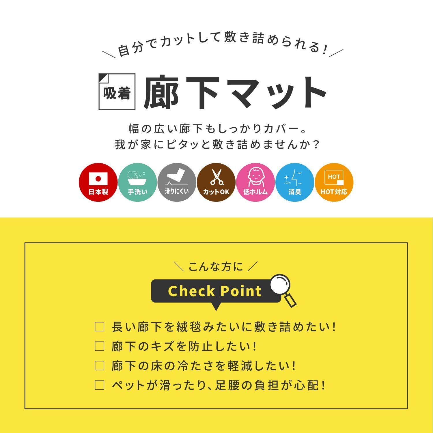 廊下やキッチンなどに敷きやすいロングタイプの吸着マットです。裏面の保護フィルムを剥がして置くだけで、滑りにくくピタッと敷くことができます。
