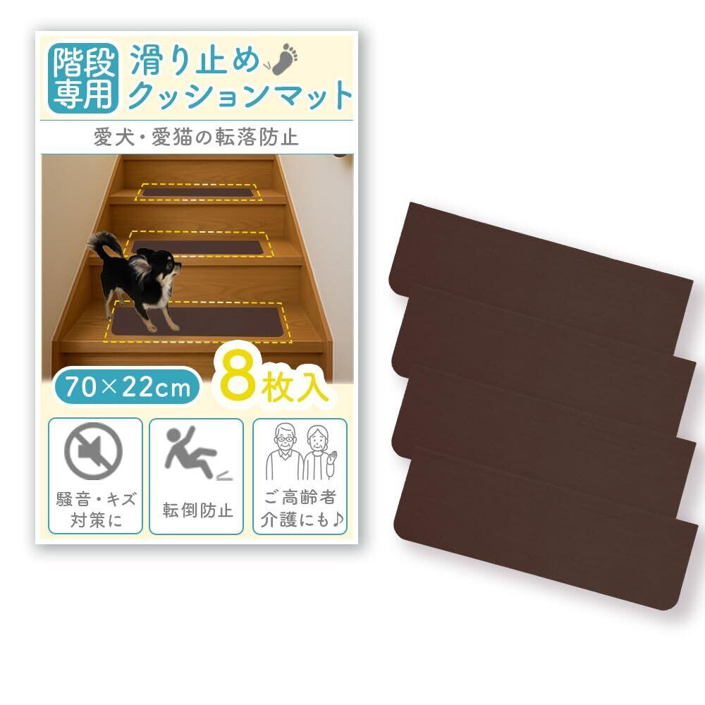 【階段の安全対策】 階段マット 滑り止め 床保護 ペット 高齢者 子供 吸着クッション 静音 カット可能 ズレない (ブラウン, 70X22cm 8枚入)