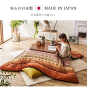 かわいらしいギャッベ柄をモチーフにした大人かわいいこたつ布団です。繊細なプリントが特徴です。表地には肌触りのよい短毛のマイクロファイバーを使用しています。部分暖房のコタツは電気代もおトクです。