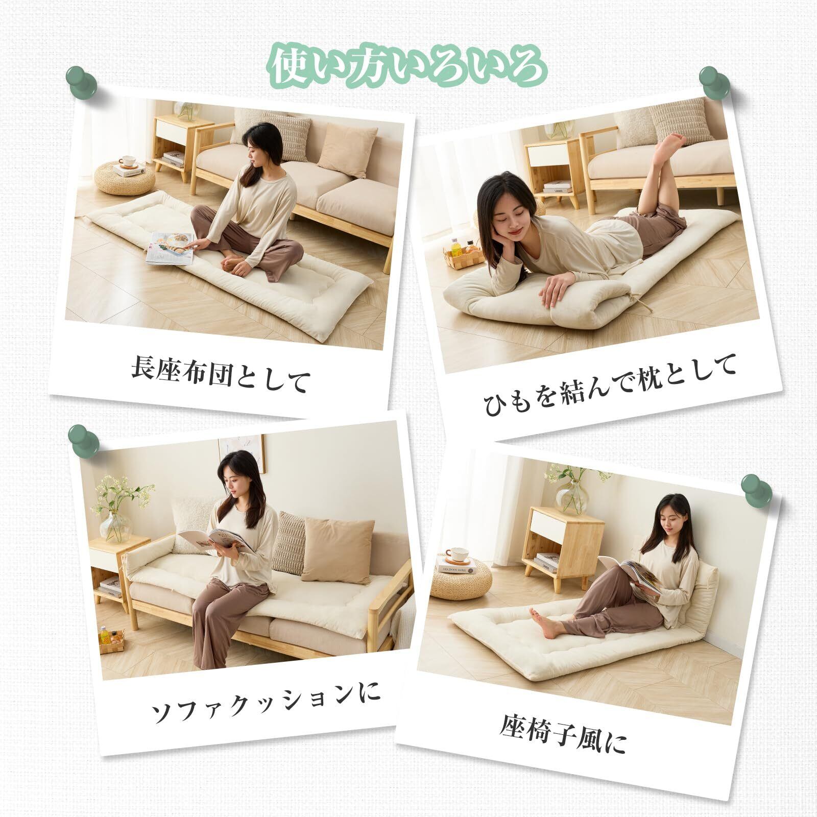 【多様な用途】ふんわりと心地いいやわらかさでリラックスタイムにぴったり。座布団として使えば2人以上が座れるので来客時にもおすすめです。ソファの上に乗せてソファクッションとしても使えます。小さく折り返して紐を留めれば枕代わりになります。肌触りが心地よい眠りに誘います。壁にくっつけて座椅子風クッションとして。読書タイムなど、サッと広げて簡単に使えます。車内使いにも便利です。【軽くて持ち運びらくらく】丸めて紐で結べば、お部屋の隅やタンス横、クローゼットにも!省スペースに収納が可能です。持ち運びも簡単でどこにでも持っていくことが可能です。