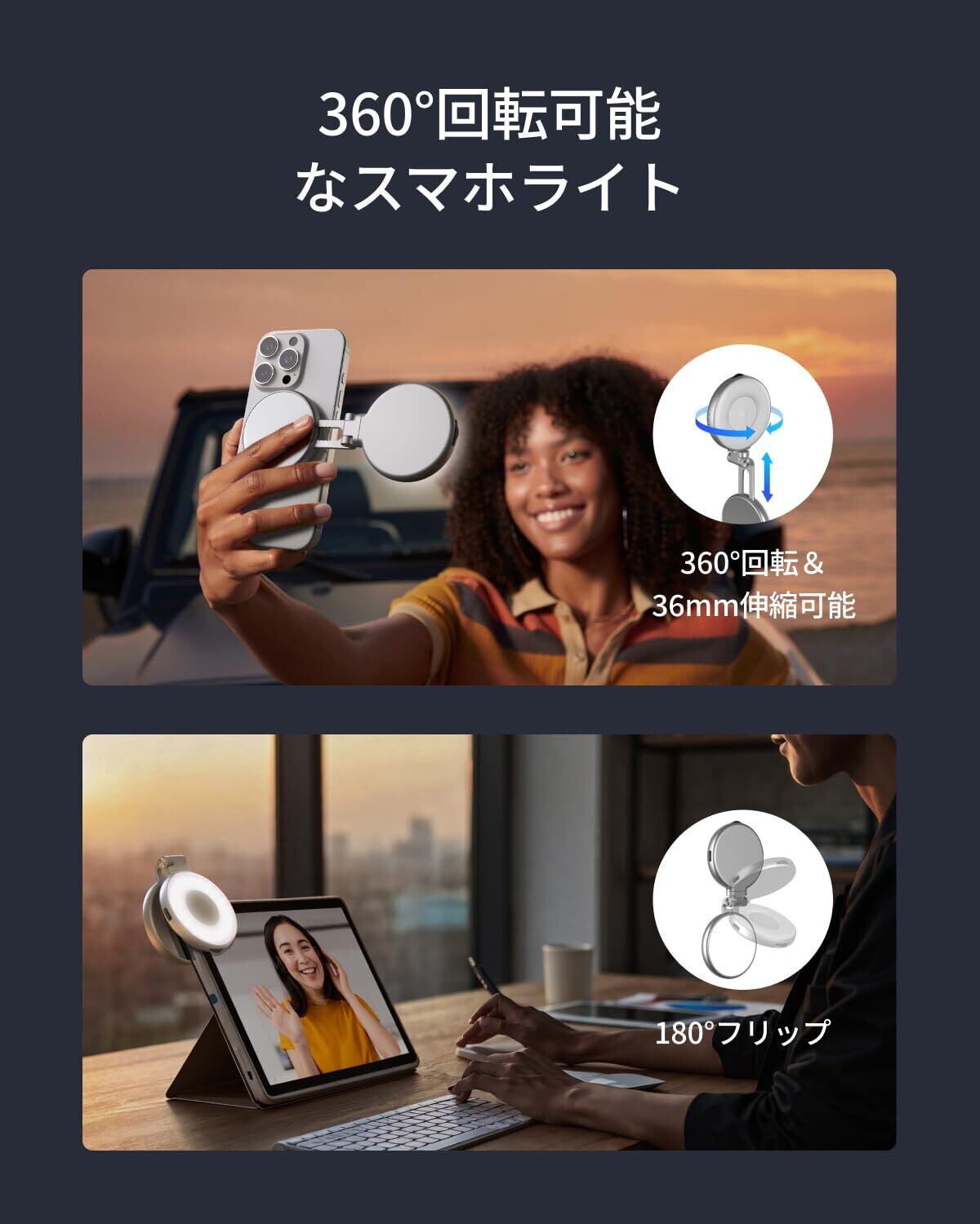 【スマホスタンドとして使用】自撮りライトはスマートフォンの背面に固定するだけでなく、自撮りや美しい写真や動画の撮影にも役立ちます。携帯用スタンドもついていて、ビデオ会議中の照明や安定性に優れています。