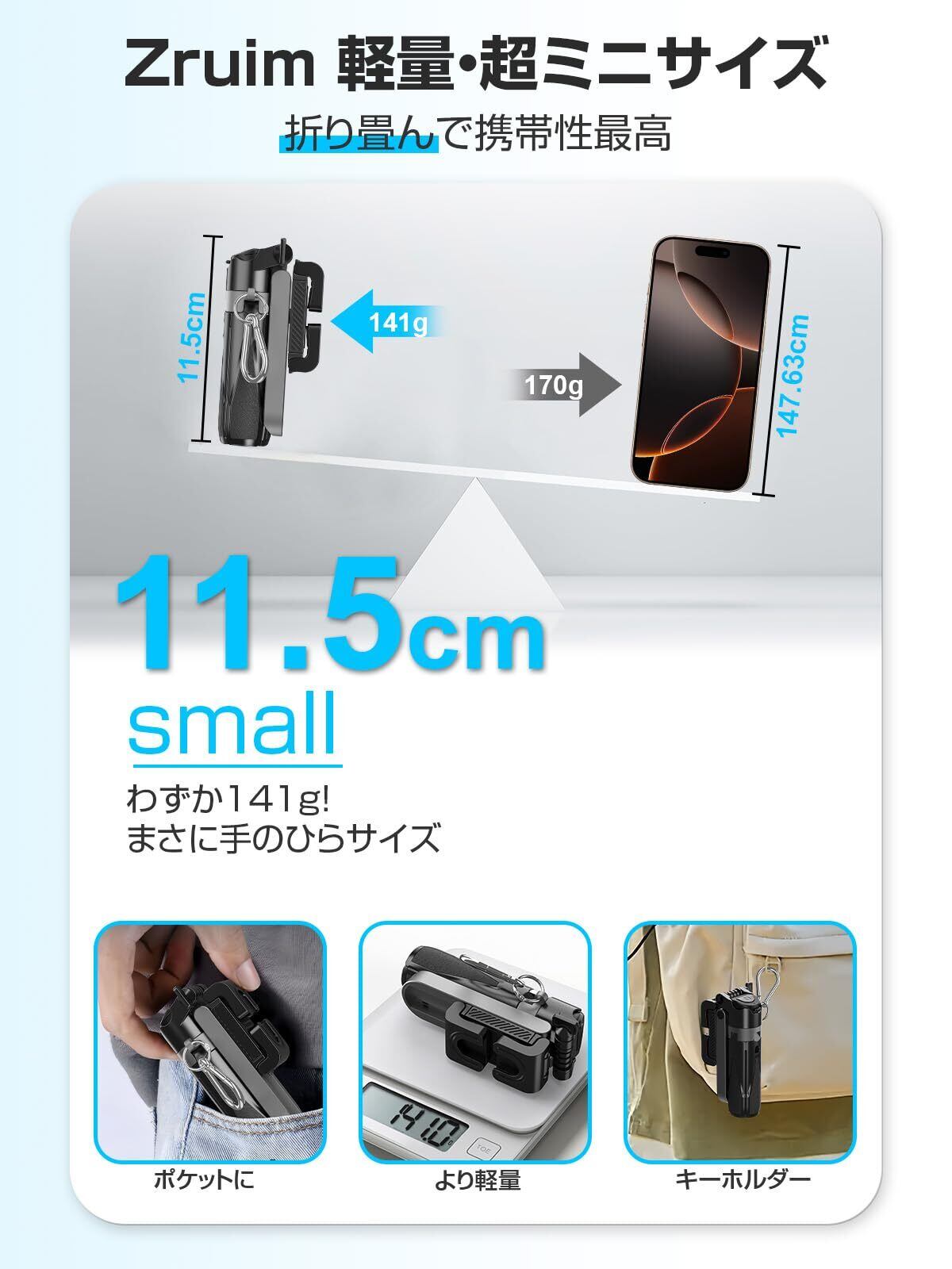 【軽量、ポケットサイズ】Zruimは自撮り棒を使用するシーンを考えて、数え切れないほどの実験の経て、自撮り棒の機能が満たされている状態で更に小型に進化しました。自撮り棒は43cmまで伸縮可能、折り畳んだ状態は11㎝、400mlのペットボトルよりも小さい、薄さは半分ぐらい、ズボンのケットにも入ります。じどり棒の重量は約140g、市販商品と比べると35%軽量化して、持ち運びは非常に便利です!