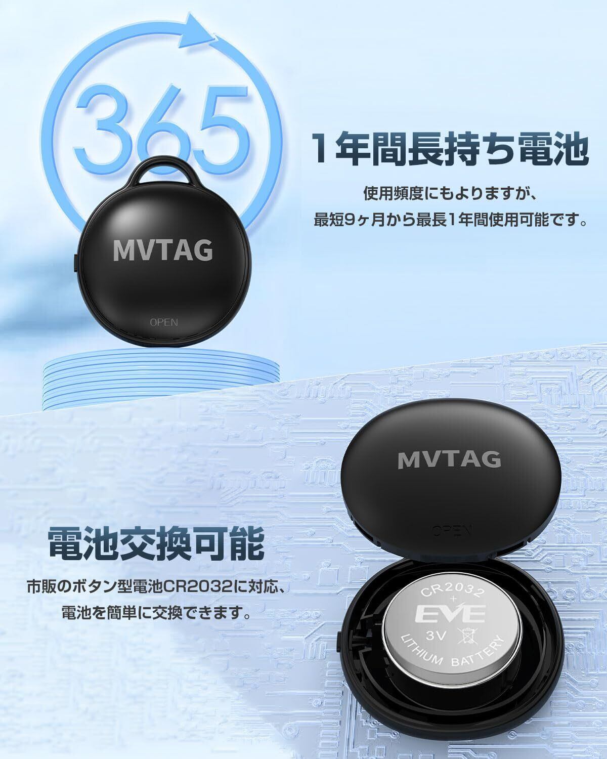 【スマートタグ & 紛失防止タグ】スマートタグとは、カバン、鍵や財布、自転車やバイクなどに取り付けて、音で物を探したり、置き忘れを防止したり、なくしたときにその現在情報を取得できる忘れ物防止 タグ/紛失防止タグです。スマートフォンに接続するだけで、物品の位置を迅速に特定できます。これより、失われた物品を探す時間と不安を大幅に減らすことができます。(※iOSのみ対応、Androidは対象外です。)【安心のApple MFi認証品 】の紛失防止タグはMFI認証済みで、Apple公式ウェブサイトのMFI認証の所で「MVTAG」を検索すれば認証済みの正規商品であることが分かります。【Appleの「探す」に対応】第三社のアプリのダウンロードは不要です。Appleの「探す」ネックワードにサポートされているため安定した接続が可能で、日本だけでなく世界中のどこでも使えます。
