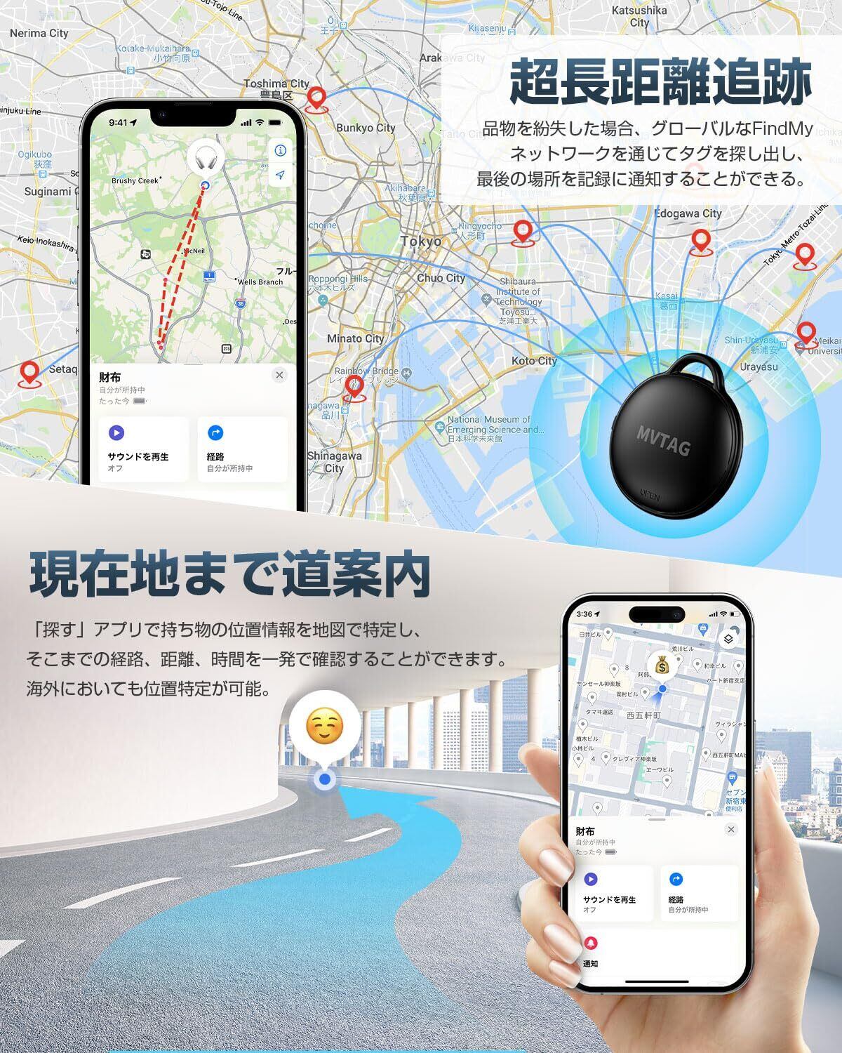【世界中で正確な測位】iPhone、iPad、Macデバイスの「探す」ネットワークで、落とし物の位置を特定できます。正確な測位とリアルタイムでの更新を実現し、世界中どこでも追跡可能。落とし物、貴重品の追跡、紛失防止、盗難防止に大変役立ちます。【探し物が上手】地図で一発で見つける!探し物の位置情報を地図で特定し、そこまでの経路、距離、時間を一発で確認することができます。