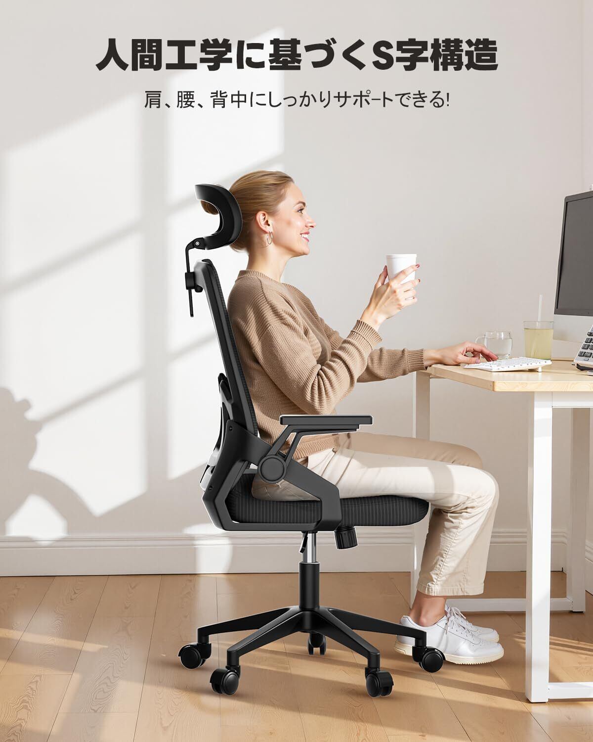 ■【長時間の作業でも疲れにくい人間工学設計!】このオフィスチェアは、人間工学に基づいたデザインで、首や腰をしっかりサポートします。跳ね上げアームと3D調整ヘッドレストを備えており、あなた自身のスタイルに合わせて調整可能です。快適な姿勢を保ちながら、作業効率もアップします!