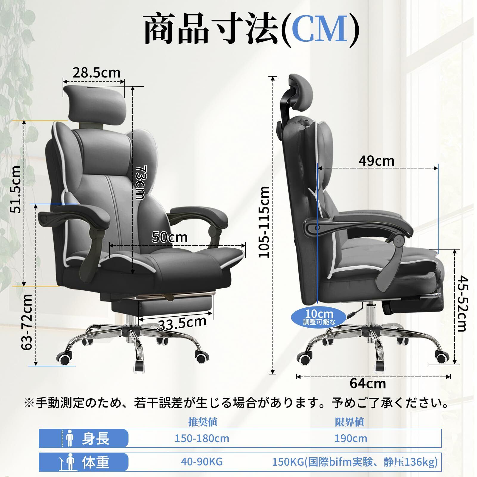 【自分好みに調整可能、様々な身長・姿勢に対応】オフィスチェアの寸法は幅52、奥49、椅子の高さ105-115cmで座面高は45-52cmです。10cm上下昇降機能ができて様々な身長の人に応じて調整できます。角度調整可能な3Dヘッドレストを搭載し、高さは4CM、45°角度を調整でき、自分に適する高さや角度を調整して完全に頭部や首を支えることができ、頭と首の圧力を効果的にかんわします。ガスシリングを搭載し、耐荷重は約150 KGに達しており、360°スムーズに回転できます。