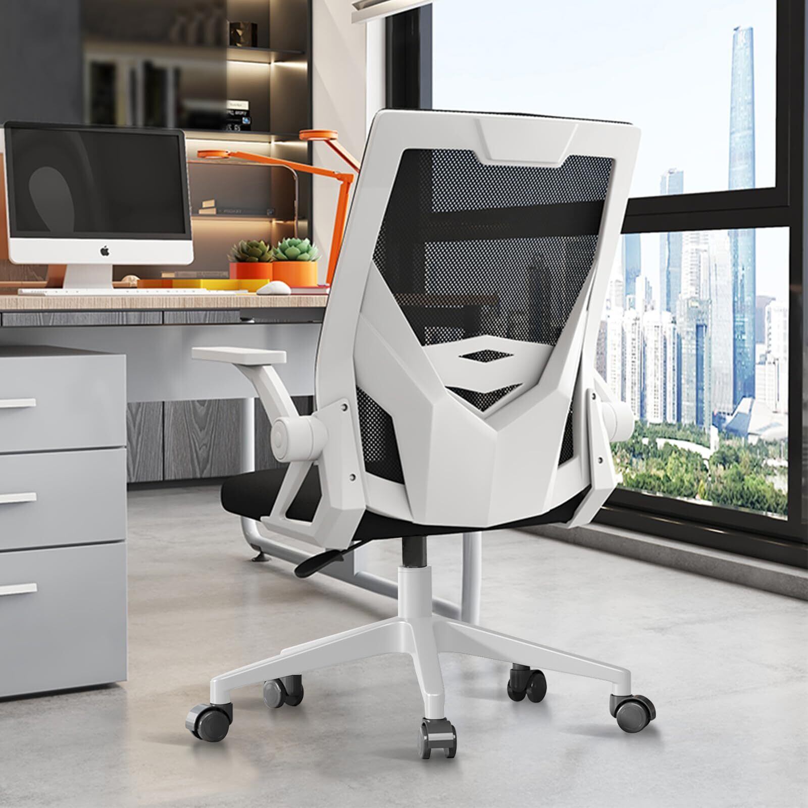 【在庫セール】EdoErgo オフィスチェア 椅子 テレワーク 疲れない 360度回転 無段階昇降 跳ね上げ式アームレスト 通気性メッシュ ロッキング機能 在宅勤務 事務/勉強椅子 テレワーク 在宅ワーク H-WY13 (黒網+白枠+白足) | SmartLiving+