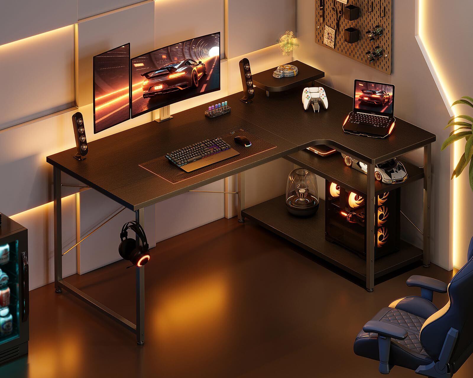 【ゲームと仕事両立】L字ゲーミングデスクは実用性が高く、ゲームプレイ、在宅勤務、書斎机、勉強机など様々なシーンで大活躍!モニター台を利用して目線をあげることで、作業時の姿勢を改善し、テレワークが快適になり、作業効率も格段に上がります。