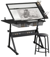 【在庫処分】EastEamily 製図テーブル 6段階高さ 図面テーブル 傾斜台 5段階角度調節可能 強化ガラス デスクトップ 頑丈 安定構造 引き出しとスツール付き 多機能収納 省スペース 簡易設置 アート・デザイン・描画・絵画・読書用 日本語説明書付き